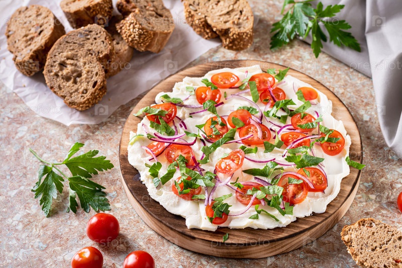 Модная масляная доска с помидорами, луком и петрушкой и ломтиками хлеба на столе
