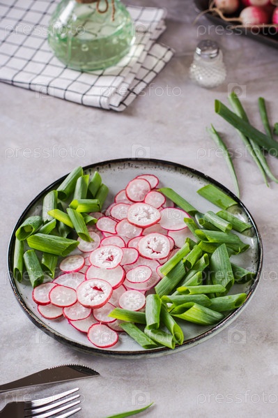 Весенний домашний салат из редьки и зеленого лука на тарелке на столе, вертикальный вид