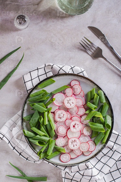 Весенний домашний салат из редьки и зеленого лука на тарелке на столешнице и вертикальный вид