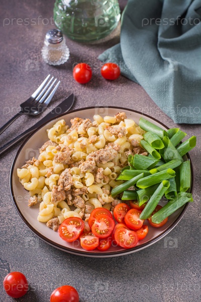Морская паста с помидорами черри и зеленым луком на тарелке на столе, вертикальный вид