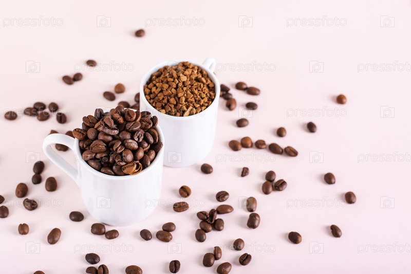 Выбор между растворимым кофе и жареными кофейными зернами в чашках на розовом фоне