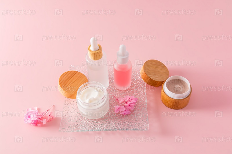 Два матовых флакончика-капельницы и две открытые баночки крема для натурального домашнего ухода за кожей лица и тела. натуральная косметика