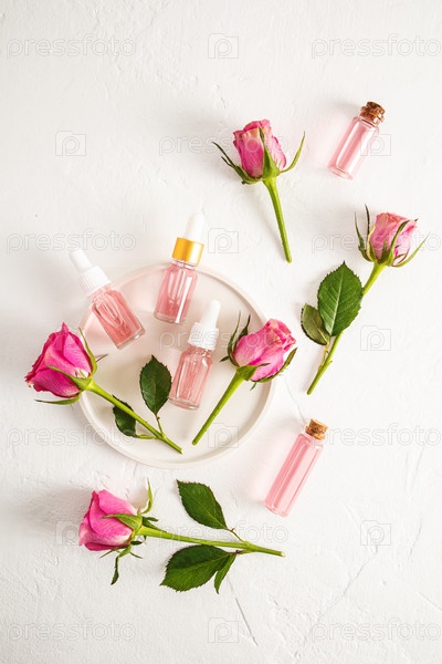 Натуральный органический продукт по уходу за кожей лица на основе масла лепестков розы в косметических флаконах на белом текстурированном фоне. Вид сверху. Вертикальный вид