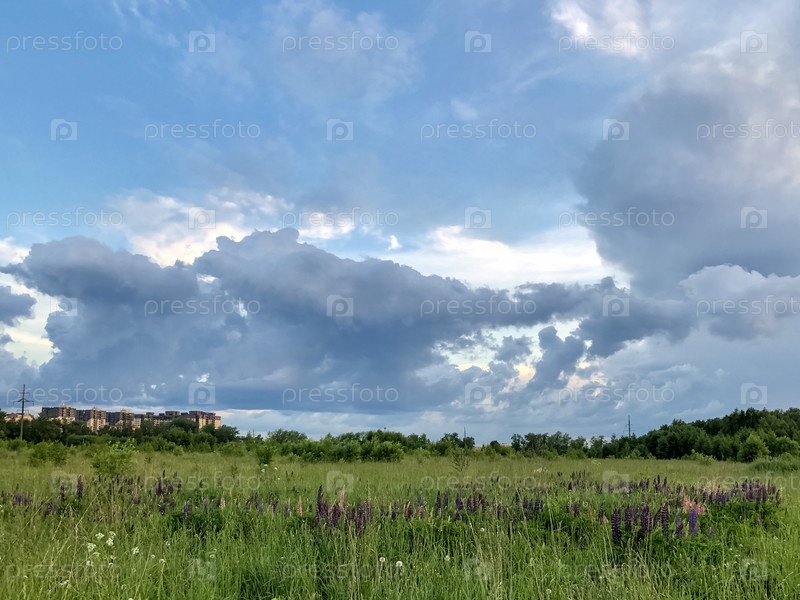 Зеленое поле с цветущими цветами люпина под грозовым вечерним пасмурным небом