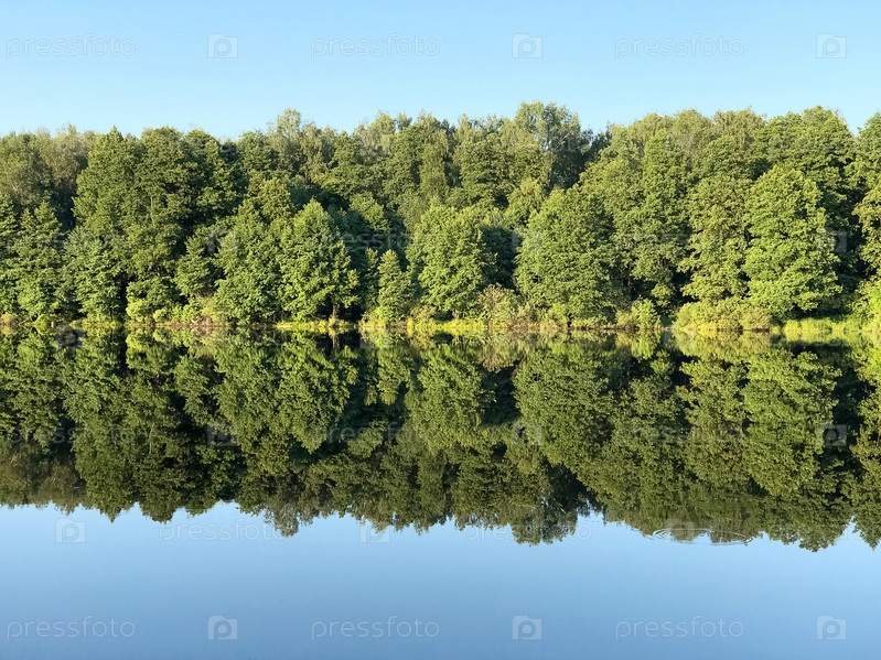 Лес отражается в неподвижной зеркальной озерной воде в летний день