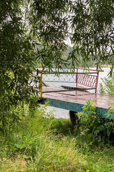 Старый деревянный пирс на берегу озера среди зелени