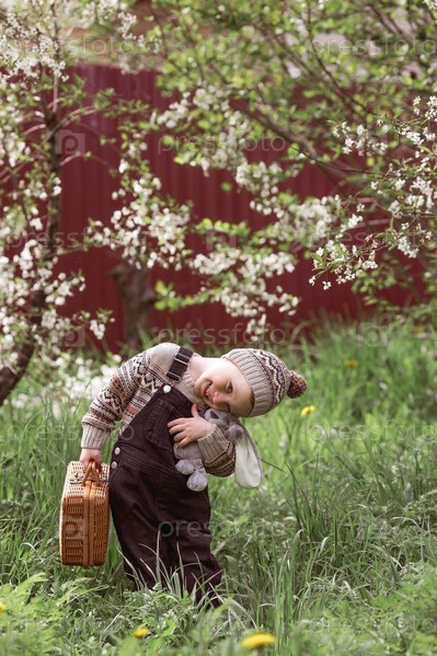 Маленький мальчик 4 лет на улице с чемоданом и плюшевым кроликом отправляется в путешествие. Красивый портрет ребенка, играющего на улице