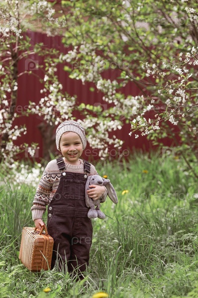 Маленький мальчик 4 лет на улице с чемоданом и плюшевым кроликом отправляется в путешествие. Красивый портрет ребенка, играющего на улице