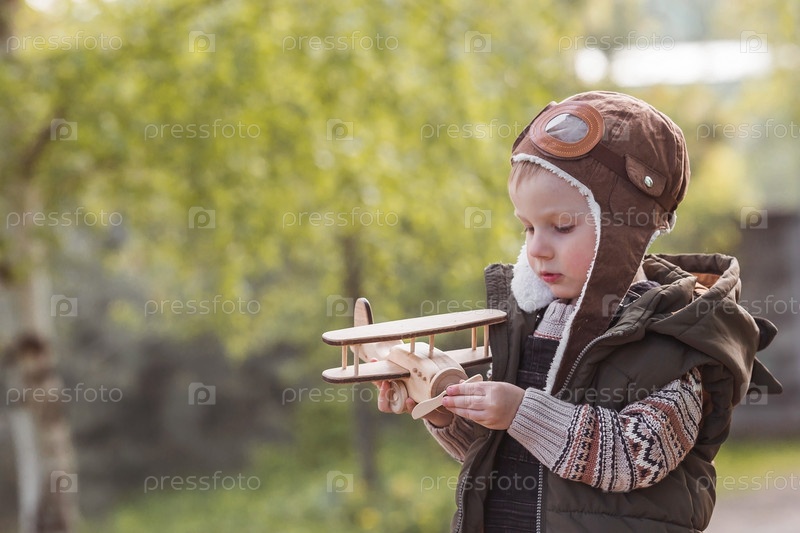 Маленький мальчик 4 лет в летной шляпе весной играет с деревянным самолетом на улице. Детские деревянные игрушки для развития ребенка