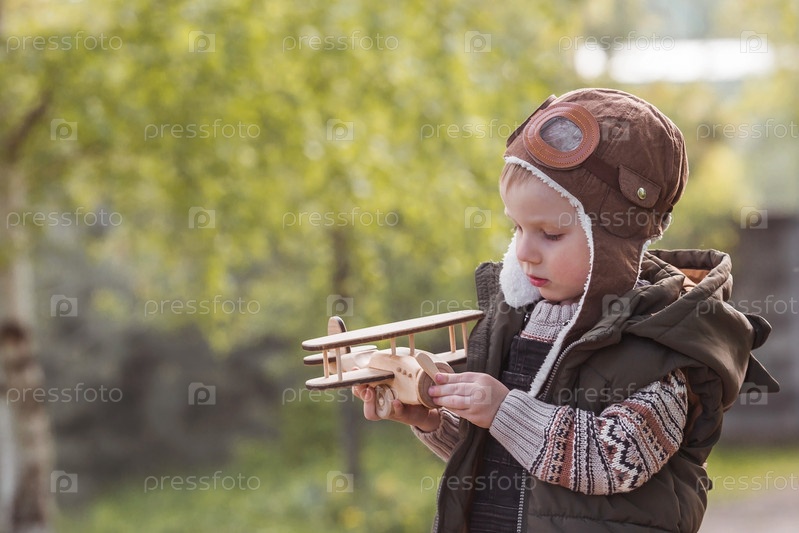 Маленький мальчик 4 лет в летной шляпе весной играет с деревянным самолетом на улице. Детские деревянные игрушки для развития ребенка