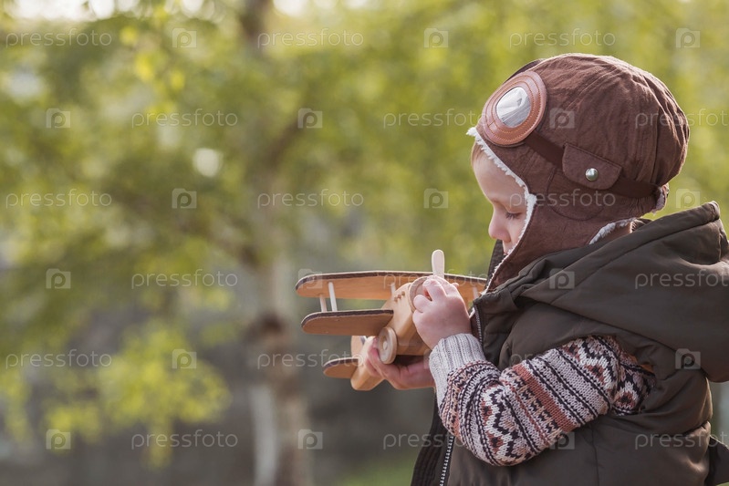 Маленький мальчик 4 лет в летной шляпе весной играет с деревянным самолетом на улице. Детские деревянные игрушки для развития ребенка