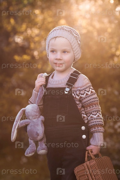 Маленький мальчик 4 лет на улице с чемоданом и плюшевым кроликом отправляется в путешествие. Красивый портрет ребенка, играющего на улице