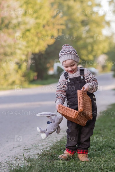 Маленький мальчик 4 лет на улице с чемоданом и плюшевым кроликом отправляется в путешествие. Красивый портрет ребенка, играющего на улице