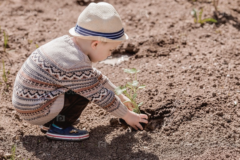 Симпатичный мальчик в шляпе сажает саженцы в летнем саду на открытом воздухе. Концепция садоводства и обучения ребенка работе