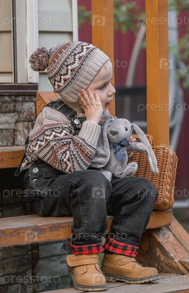 Маленький мальчик 4 лет в стильной одежде сидит на деревянном крыльце с мягкой игрушкой возле дома на открытом воздухе. Красивый портрет улыбающегося ребенка на улице. Счастливое детство