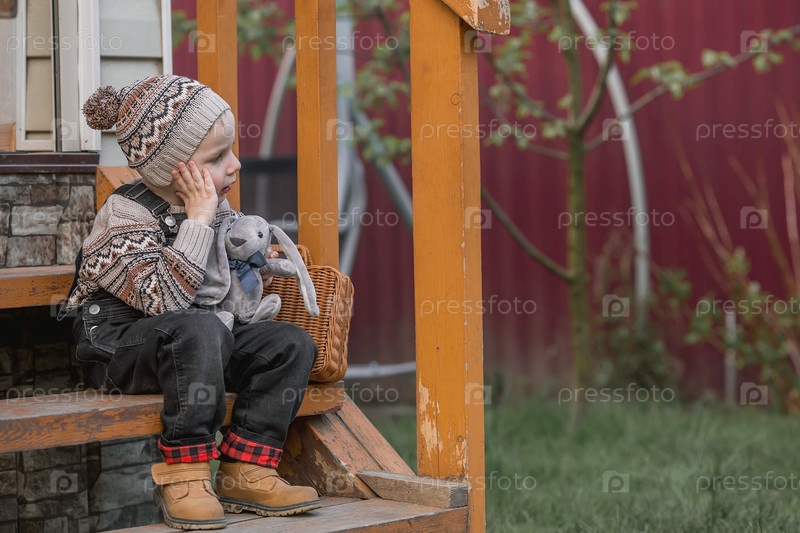 Маленький мальчик 4 лет в стильной одежде сидит на деревянном крыльце с мягкой игрушкой возле дома на открытом воздухе. Красивый портрет улыбающегося ребенка на улице. Счастливое детство
