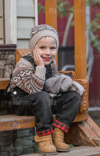 Маленький мальчик 4 лет в стильной одежде сидит на деревянном крыльце с мягкой игрушкой возле дома на открытом воздухе. Красивый портрет улыбающегося ребенка на улице. Счастливое детство