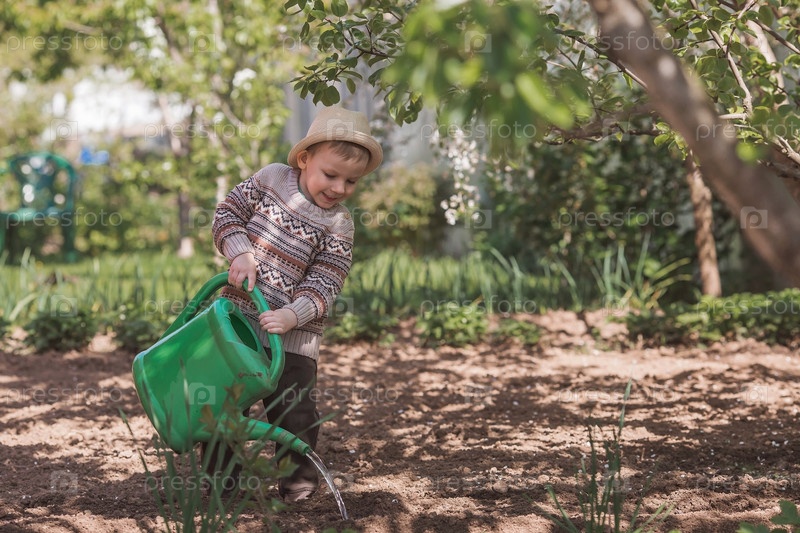 Милый мальчик в шляпе сажает и поливает рассаду из лейки в летнем саду на открытом воздухе. Концепция садоводства и обучения ребенка работе