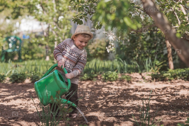 Милый мальчик в шляпе сажает и поливает рассаду из лейки в летнем саду на открытом воздухе. Концепция садоводства и обучения ребенка работе