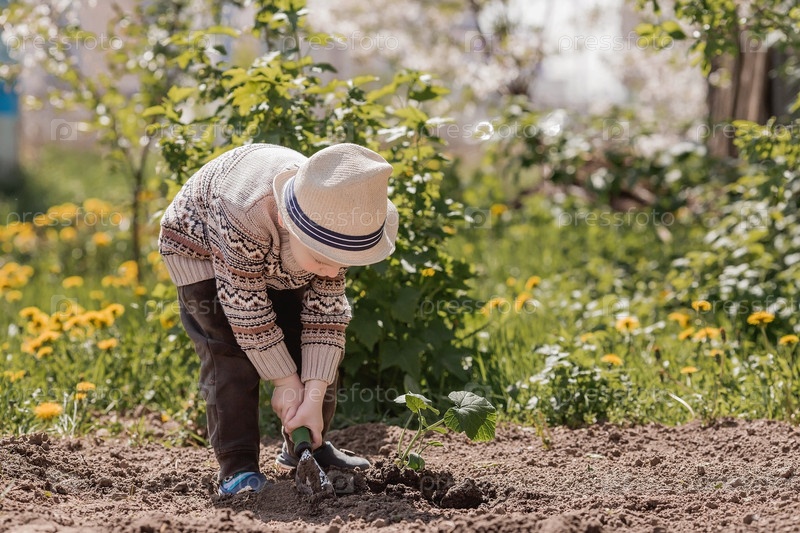 Симпатичный мальчик в шляпе сажает саженцы в летнем саду на открытом воздухе. Концепция садоводства и обучения ребенка работе