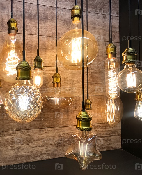 Разнообразие электрических лампочек различной формы на деревянном фоне