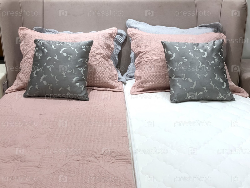 Двуспальная кровать с цветными декоративными подушками, разделенная пополам разноцветными покрывалами