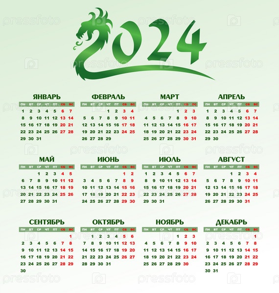 Зеленый шаблон календаря на 2024 год с драконом