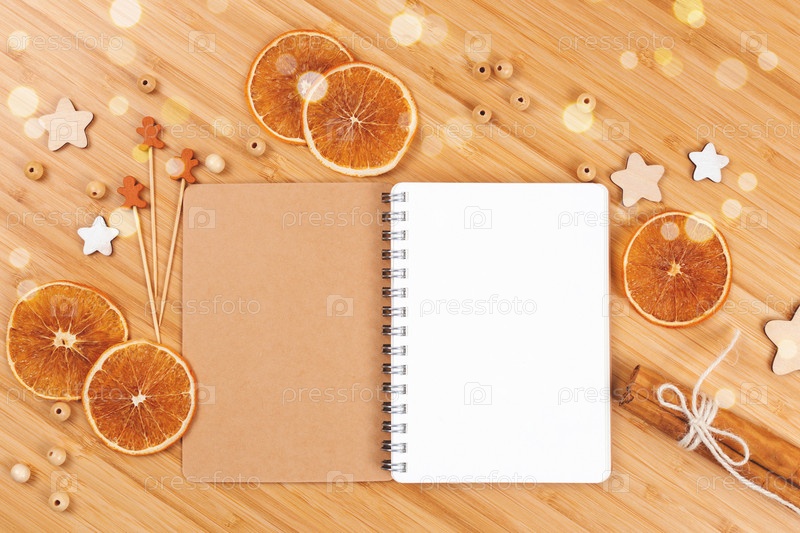 Фон рождественской пекарни с открытой пустой тетрадью, сушеными дольками апельсина, палочками корицы и деревянными украшениями