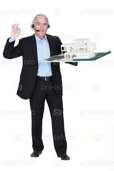 Седой проектировщик жилья с гарнитурой на голове