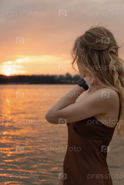 Молодая женщина любуется закатом на берегу реки летним вечером