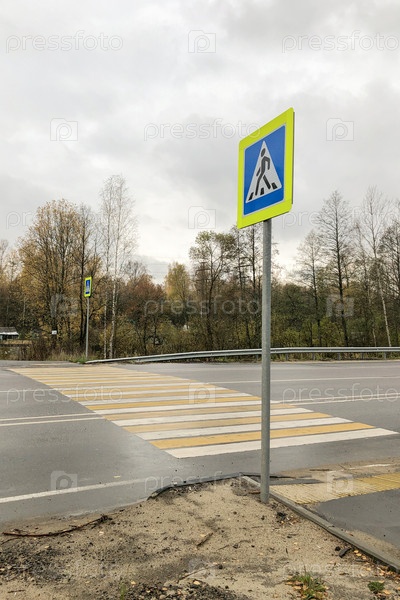Желто-белая зебра и дорожный знак пешеходного перехода через дорогу