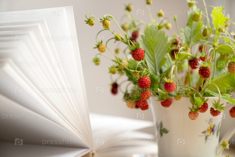 Спелые красные ягоды земляники на ветках, собранные в кучу в чашке чая рядом с открытой книгой