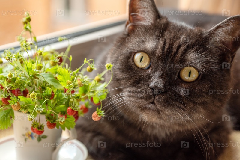 Милый кот с желтыми глазами нюхает ветку земляники с красными спелыми ягодами