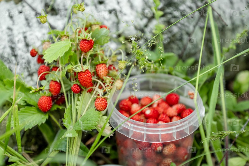 Пластиковая чашка, наполненная спелой красной земляникой, и сбор клубничной веточки в лесу