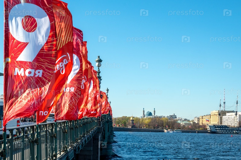 Санкт-Петербург, Россия - 08 мая 2023 года. Праздничные флаги ко Дню Победы украшают Троицкий мост