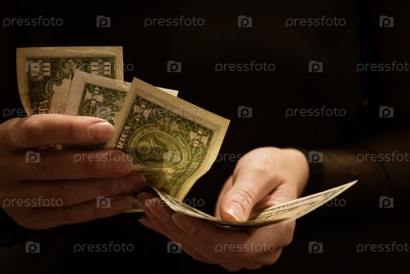 Женщина считает банкноты долларов в руках, темный фон