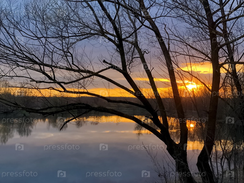 Уединенный силуэт дерева над озером с оранжевым светом захода солнца на горизонте