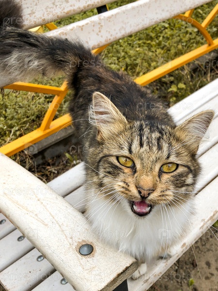 Симпатичная полосатая бездомная кошка сидит на уличной скамейке