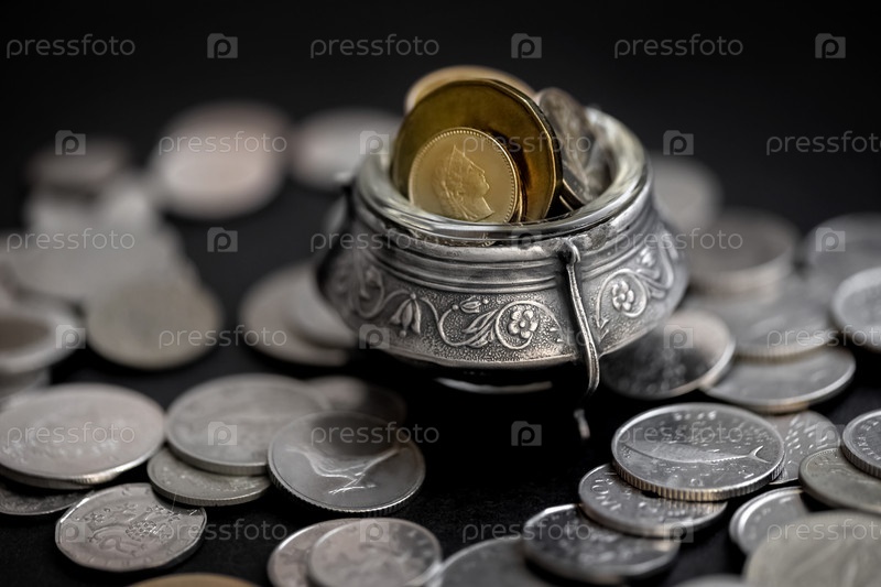 Старинный серебряный горшок, полный золотых монет, стоит среди россыпи серебряных монет на темном фоне