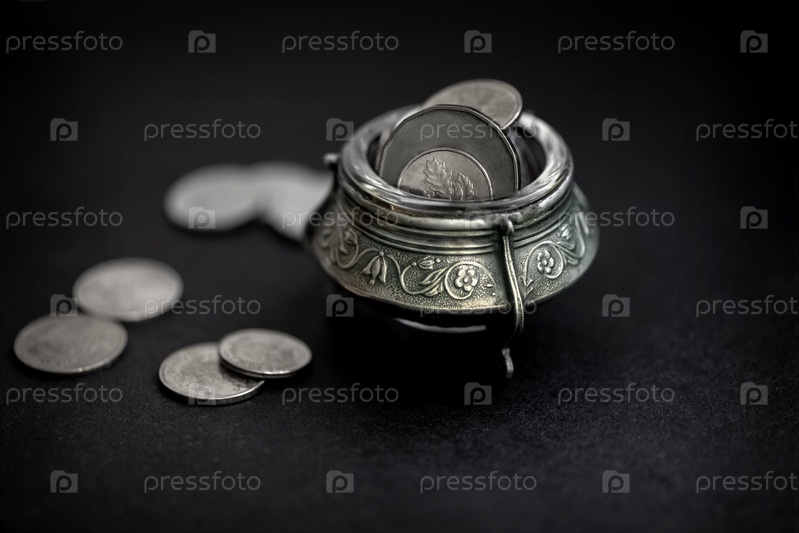 Серебряный горшок, полный монет на черном фоне. Концепция сокровищ лепреконов