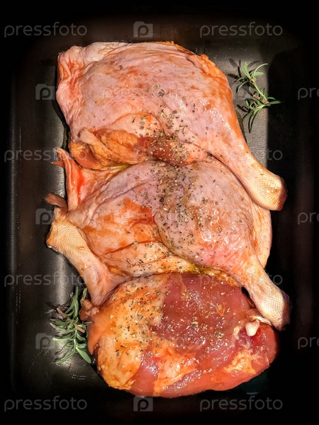 Курица с розмарином и специями на черном противне готова к запеканию в духовке