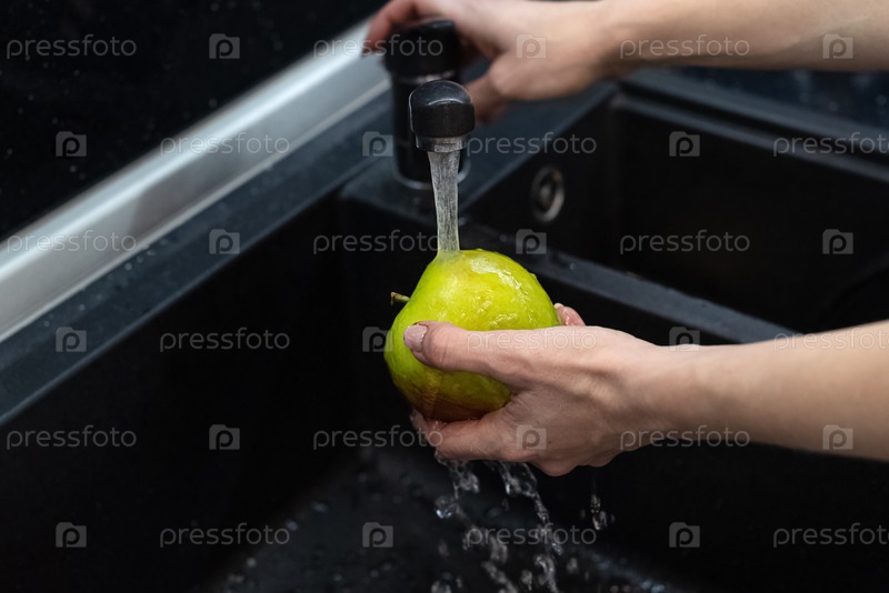 Человек моет яблоко под проточной водой в кухонной раковине
