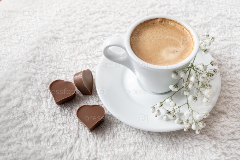 Утренняя чашка крепкого кофе эспрессо с шоколадными конфетами в форме сердца подается в постель. Празднование Дня Святого Валентина
