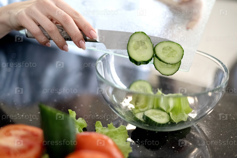 Процесс приготовления овощного салата, перекладывание ломтиков огурца в стеклянную миску. Здоровое веганское питание и образ жизни