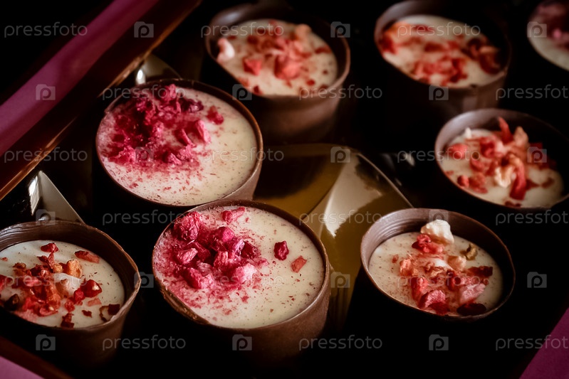 Ассортимент шоколадных конфет с фруктами в коробке, вид сверху