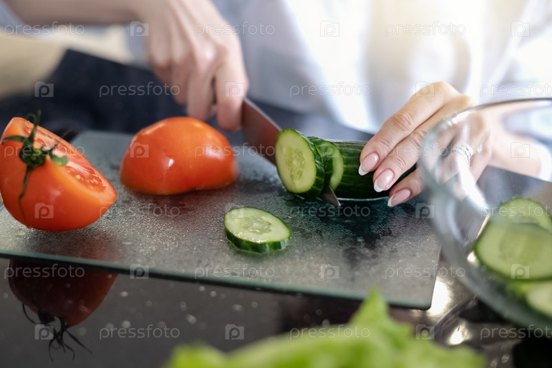 Процесс приготовления овощного салата. Нарезка огурцов и помидоров. Здоровое веганское питание и образ жизни