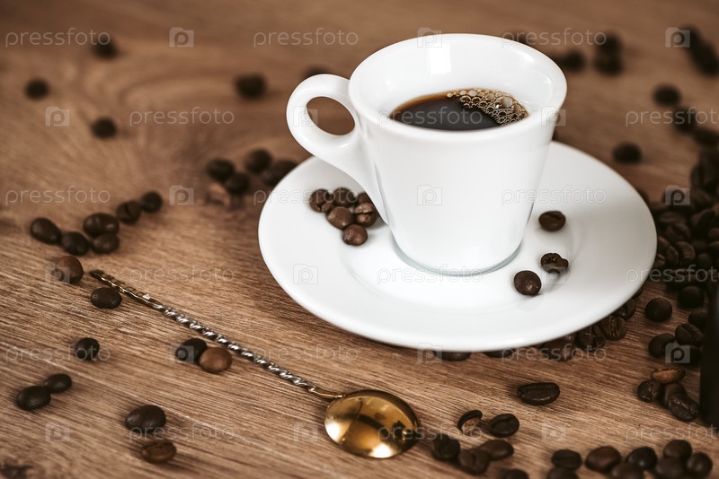 Белая маленькая чашка свежесваренного кофе эспрессо на поверхности стола с разбросанными жареными кофейными зернами