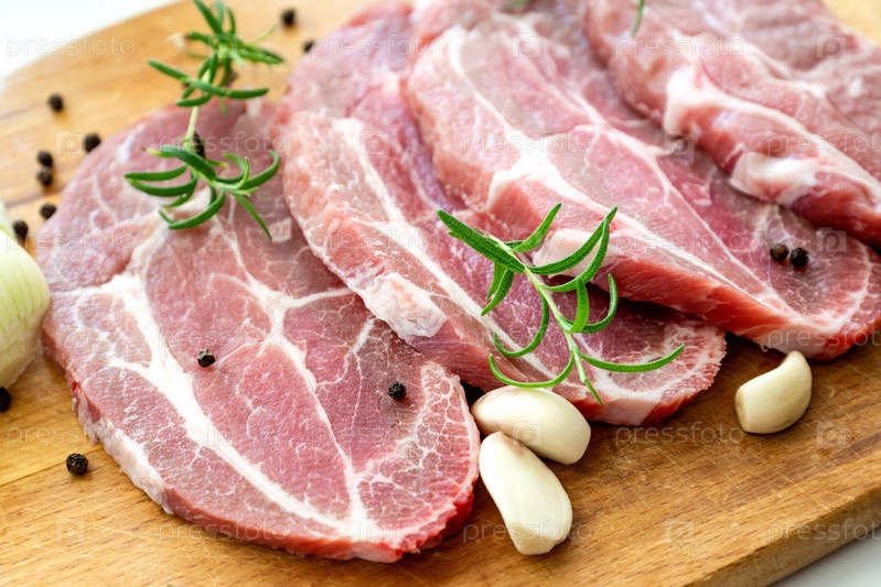 Нарезанное сырое мясо свинины со свежим розмарином, луком, перцем и чесноком на разделочной доске