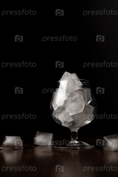 Бокал вина, наполненный кубиками льда при мягком освещении на темном фоне