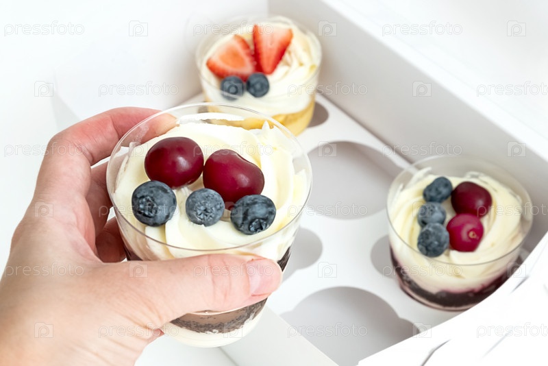 Человеческая рука берет десерт со сливками и ягодами из полупустой коробки